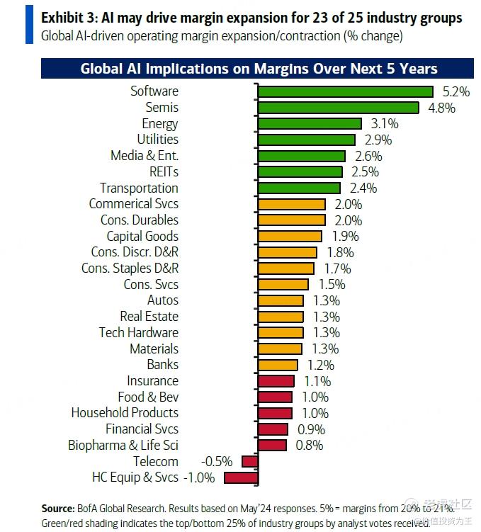 分析师预计AI可能在未来5年内,帮助企业的营业利润率提升200个基点,其中,软件和半导体的利润率提升最为明显,其次是能源和公用事业,电信及HC设备和服务利润率可能会收缩: