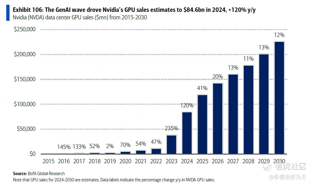 其中,预计GenAI 浪潮推动 Nvidia 的 GPU 销售额预计在 2024 年达到 846 亿美元,同比增长120%,预计明年的增速是41%: