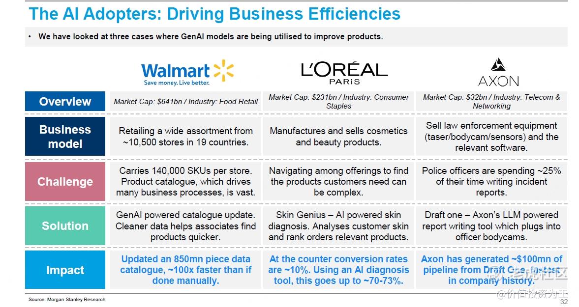 分析师拿沃尔玛、欧莱雅和AXON举例,证实AI工具对企业各自业务产生了实质性帮助,如帮助欧莱雅的客户转化率提升10%、帮助沃尔玛工作人员快速梳理数据目录,比手工操作快100倍: