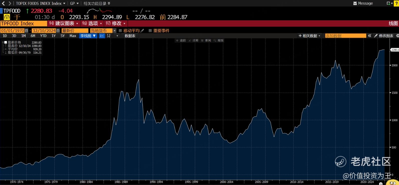 从日本股市来看,东证食品指数在上世纪90年代房地产泡沫破裂后,一路跌至2004年,才在全球大牛市的带动下稍有反弹,如果说真正意义上的反转,需要等到2011年安倍经济学大显神威的时候: