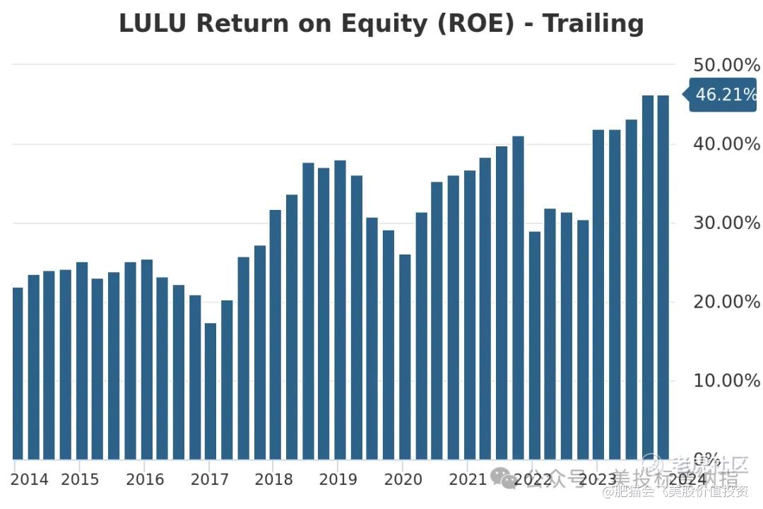 答案在于LULU过去亮眼的业绩表现彰显其是一家优秀的公司。LULU的债务水平较低(Debt/Equity小于0.4),TTM ROE过去十年除了个别季度以外均高于20%,甚至过去两个季度还高达40%以上。