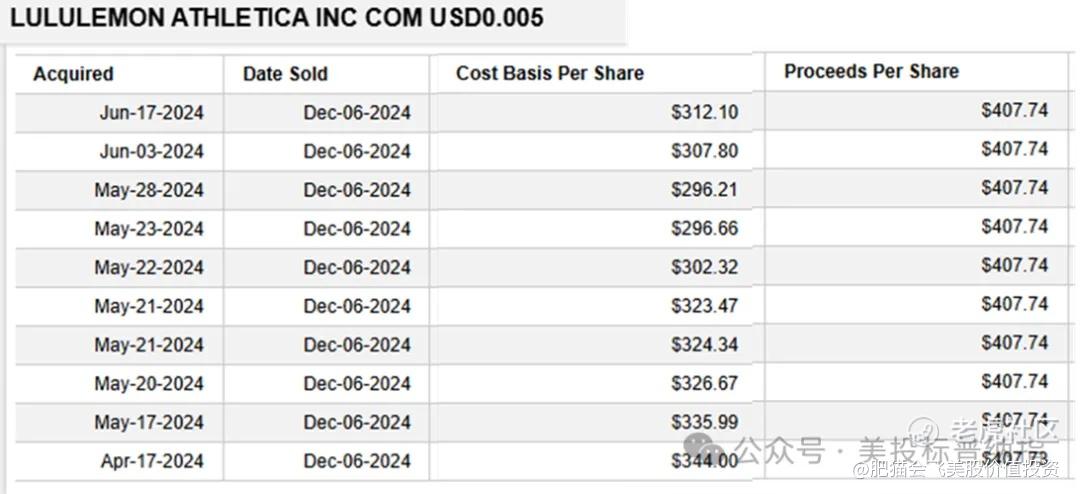 肥猫君从4月中旬开始持续买入LULU,直到7月末因仓位过大停止加仓。最低买入价格每股251.63美元(尚未卖出,因此没有出现在下表中),期间一度浮亏-15%。在当天股价暴涨18%后,肥猫君卖出部分仓位锁定盈利,总体盈利约为27%(年化收益约为54%)。