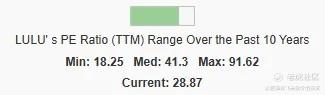 除公司优秀基本面外,另一个同样重要的原因是,肥猫买入LULU的价格相对较低。4月至8月LULU的TTM市盈率约为19~29,处于过去10年的历史低位区间,尽管肥猫君未能准确抓住谷底价格。这符合了肥猫君强调的“对价格敏感”的原则。参考《【散户必读】为什么说长期投资者也要对股价保持敏感?》