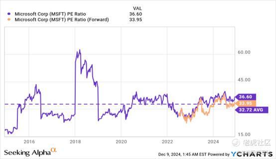 换句话说,未来几年的这些降低的预测理论上可以为微软继续超出预期提供一个坚实的基础,因为公司在最近几个季度一直这样做。所以如果推理在这里是正确的,微软目前基于明年预测每股收益的估值并没有完全捕捉到事件的真实状态。目前,市场预计微软将在2025财年以近34倍的预期市盈率交易,预计每股收益将仅增长10.7%(对于2025财年)。然而,相信公司可能会比共识预期显示的增长更强,因为在2025财年下半年,一些今天的逆风将会缓解,这将导致表现改善,因此,市盈率倍数会降低。所以如果预期市盈率倍数下降到27-28倍左右,微软实际上将比过去十年的历史平均估值更便宜: