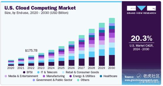 微软云仍然是该公司的增长引擎,销售额为389亿美元,较上年增长22%。按固定汇率计算,Azure同比增长33%,人工智能服务贡献了12%的增长。另一方面,由于“有限的容量和延迟的第三方数据中心租赁”,Azure的增长在上个季度略有放缓。尽管Azure在第二季度的增长放缓至31-32%,令分析师感到担忧,但消费动态仍未改变。此外,管理层在财报电话会议上表示,随着新的第一方数据中心的开放,预计2025财年下半年将重新加速增长。此外,微软的人工智能项目——比如与OpenAI合作的项目——下个季度的运转率将超过100亿美元,成为微软历史上增长最快的业务。鉴于该公司可以利用其基础设施和产品生态系统扩大人工智能的货币化规模,这一领域的盈利增长仍处于初期阶段,根据Grand View Research的数据,预计从2024年到2030年,美国云计算市场规模将以20.3%的复合年增长率增长。