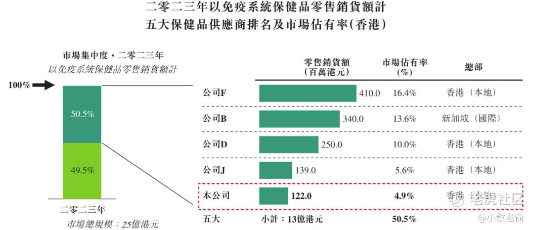 免疫系统保健品为专门配制的产品,用于强化或改善人体对疾病及感染的先天防御机制。香港免疫系统保健品市场相对集中,以2023年零售销货额计,五大本地保健品供应商的总市场占有率为50.5%。香港约有50至100个提供免疫系统保健品的品牌,其中大部分为本地业者。于2023年,以香港免疫系统保健品零售销货额计,本公司在所有保健品供应商中排名第五,在本地保健品供应商中排名第四,市场占有率为4.9%。