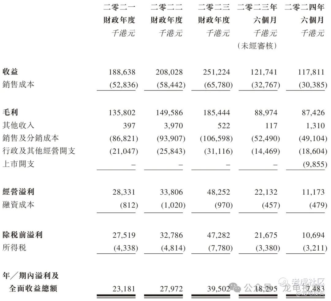 毛利:2021年毛利1.35亿港元,2022年毛利1.49亿港元,2023年毛利1.85亿港元,截止2024年6月30日最近12个月毛利1.83亿港元。