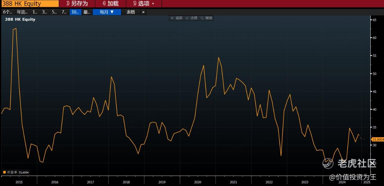 估值方面,港交所的市盈率在25-50倍之间波动,目前32倍,若后市有牛市,港交所还有大幅上升空间: $香港交易所(00388)$
