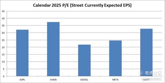 从市盈率来看,苹果股票比一些大型科技股略贵,如下表所示。截至周三收盘,苹果的交易价格略高于其2025年日历年度预期收益的32.1倍。这比亚马逊、Alphabet、微软和Meta Platforms的平均价格高出10%以上。但在这里,你支付的平均价格溢价,不要忘记苹果预计在2025年的收入和收益增长是这些公司中最少的。