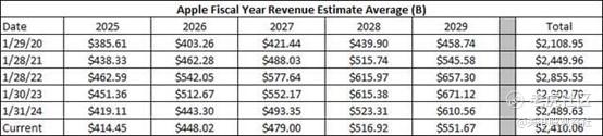 然而,不仅仅是短期预期对苹果来说正在下降。正如在下面的表格中看到的,市场已经连续几年大幅降低了对公司的5年预期。公司已经取消了推出电动汽车的计划,据报道,Vision Pro头显的低迷销量导致了戏剧性的生产削减。提醒一下,苹果的财年在9月底结束。