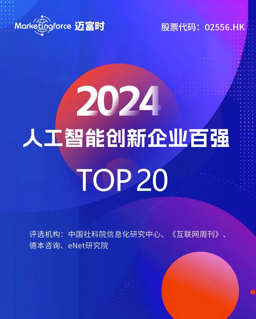 中国社科院信息化研究中心、《互联网周刊》、德本咨询、eNet研究院重磅发布“2024年度人工智能创新企业100强”榜单,Marketingforce迈富时(珍岛集团)凭借其在AI与数智化领域的卓越创新实力,成功进入TOP20。