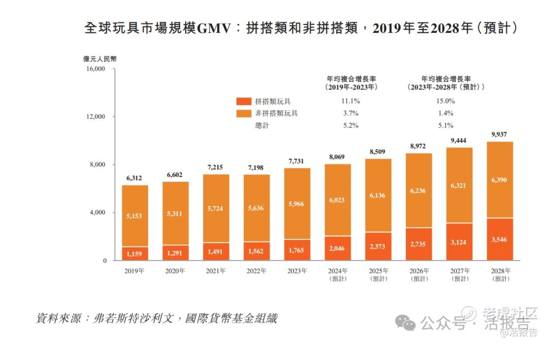 拼搭类玩具是全球玩具市场中高速增长的一个细分市场。拼搭类玩具一般需要消费者投入一定的时间,将各类不同形状、大小和功能的组件组合拼搭为不同形态的玩具成品,例如角色、载具和建筑等。相比非拼搭类玩具,拼搭类玩具在具有更高的互动性,既可以按照产品的设计思路拼成确定形态的成品,又可以根据消费者的个性化想法进行一定的创意发挥,具备相对更强的可玩性和益智性。此外,拼搭类玩具所用零部件一般具有一定比例的标准通用件,通常可在不同产品之间兼容,并且能够较好地控制质量和成本,从而实现更强的消费者黏性和品牌忠诚度。2023年全球拼搭类玩具的市场规模达到人民币1,765亿元,尽管2023年该品类在全球玩具市场的占比仅有22.8%,但2019年至2023年的年均复合增长率达到11.1%,且2023年至2028年的年均复合增长率预计将达到15.0%,远超过非拼搭类玩具的增速。