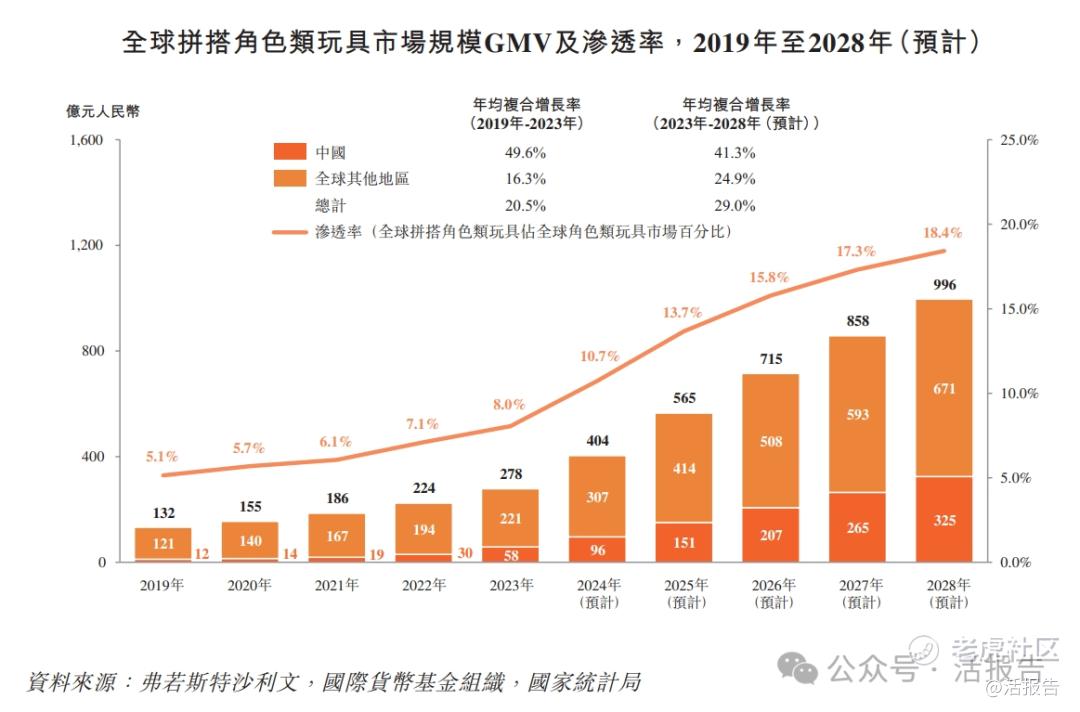 拼搭角色类玩具是全球玩具行业增速最快、极具发展前景的细分品类。全球拼搭角色类玩具市场规模从2019年的人民币132亿元增长至2023年的人民币278亿元,在全球角色类玩具市场的渗透率为8.0%,2019年至2023年的年均复合增长率达到20.5%。拼搭角色类玩具兼具了拼搭玩法和角色类玩具的优势,能够持续扩大在角色类玩具市场的份额,预计2023年至2028年年均复合增长率为29.0%,市场规模在2028年将达到人民币996亿元,在全球角色类玩具市场的渗透率为18.4%。其中,中国拼搭角色类玩具的市场规模将从2023年的人民币58亿元增长到2028年的人民币325亿元,2023年至2028年的年均复合增长率为41.3%。