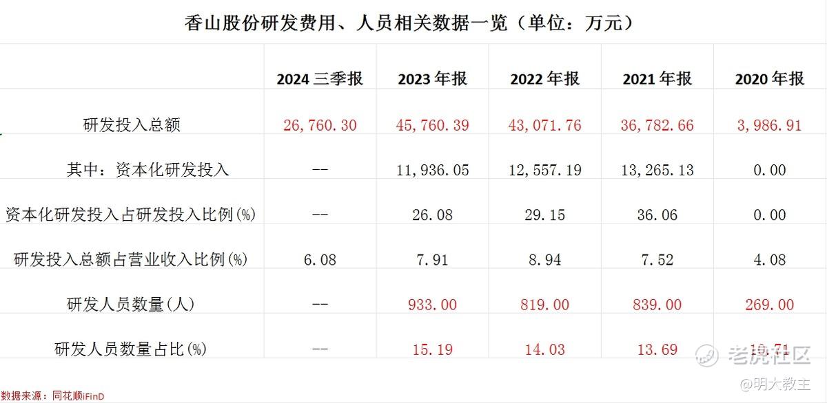 香山股份每年都保持了适度且偏强的研发强度。2021至2023年,香山股份研发人员数量由839人增加至933人,研发人员数量占比由13.69%升至15.19%。
