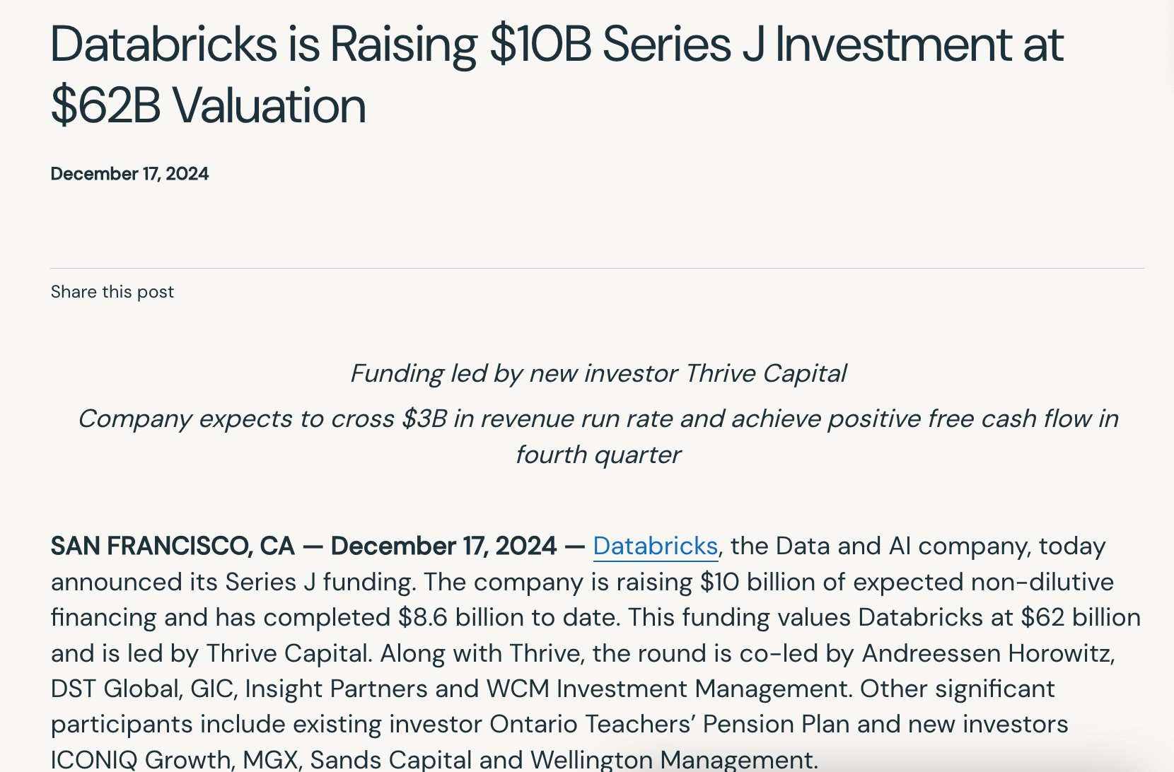 美东时间12月17日,数据分析和AI平台巨头Databricks宣布完成100亿美元J轮融资,公司估值从此前的430亿美元攀升至620亿美元。本轮融资由Thrive Capital领投,多家知名投资机构参与本轮融资,包括Andreessen Horowitz、DST Global、GIC、Insight Partners和WCM Investment Management作为共同领投方。此外,安大略教师退休金计划、ICONIQ Growth、MGX、Sands Capital和Wellington Management也参与其中。该轮融资将用于投资于新的AI产品、收购以及大幅扩张其国际市场业务。