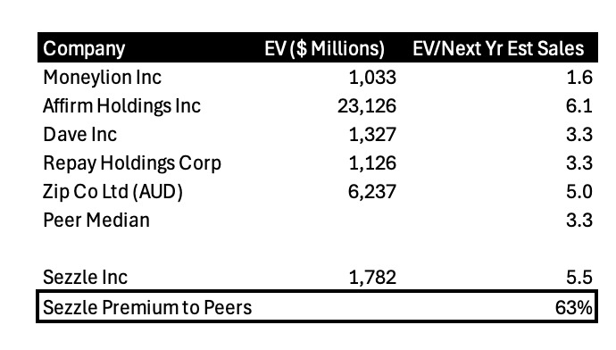 在 BNPL 市场,Sezzle 面临激烈竞争,像 Affirm、Klarna 等公司都给它带来很大压力。从 2021 年起,Sezzle 活跃商户数量减少超 51%,意味着其市场份额正在快速流失。尽管宣称有 23000 家活跃商户,但有数据显示实际数量可能更低,进一步削弱了它的市场地位。而且它比同行的估值贵非常多: