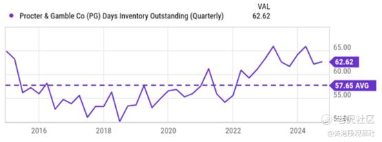 企业的库存增长是完全正常的,甚至是可取的,只要它与销售同步。不幸的是,从宝洁的未完成库存(DIO)数据来看,宝洁的情况并非如此。对于不熟悉这个概念的读者来说,DIO是衡量公司出售库存所需时间的指标。如下图所示,宝洁的长期平均DIO约为57.65。从大约2021年开始,其DIO开始呈上升趋势,并保持在平均水平以上。截至其最新财报,其DIO徘徊在62.62左右,不仅远高于其长期平均水平,而且也是过去十年来的最高水平之一。