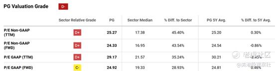 尽管财报喜忧参半,且库存令人担忧,但宝洁的股价似乎已经被充分估值。如下图所示,其整体估值等级是D-。也就是说,其市盈率(以TTM和非GAAP为基础)是25.27,比行业中位数17.38高出45.40%,这在很大程度上是合理的,因为考虑到股票在行业中的领先地位和其卓越的财务实力。然而,请注意,当前的市盈率也与其自身的过去平均水平一致,表明估值合理。