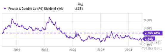 当以股息收益率来衡量时,估值风险增加。鉴于宝洁作为股息增长股票的典范,股息支付是其真实经济收益的好衡量标准,因此股息收益率是一个重要的估值参数。如图所示,其股息收益率在过去的大部分时间里在2%到3.6%之间波动。过去10年的平均股息收益率约为2.75%。当前的股息收益率为2.33%,不仅低于长期平均水平,也是至少10年来的最低水平之一,表明估值风险增加。