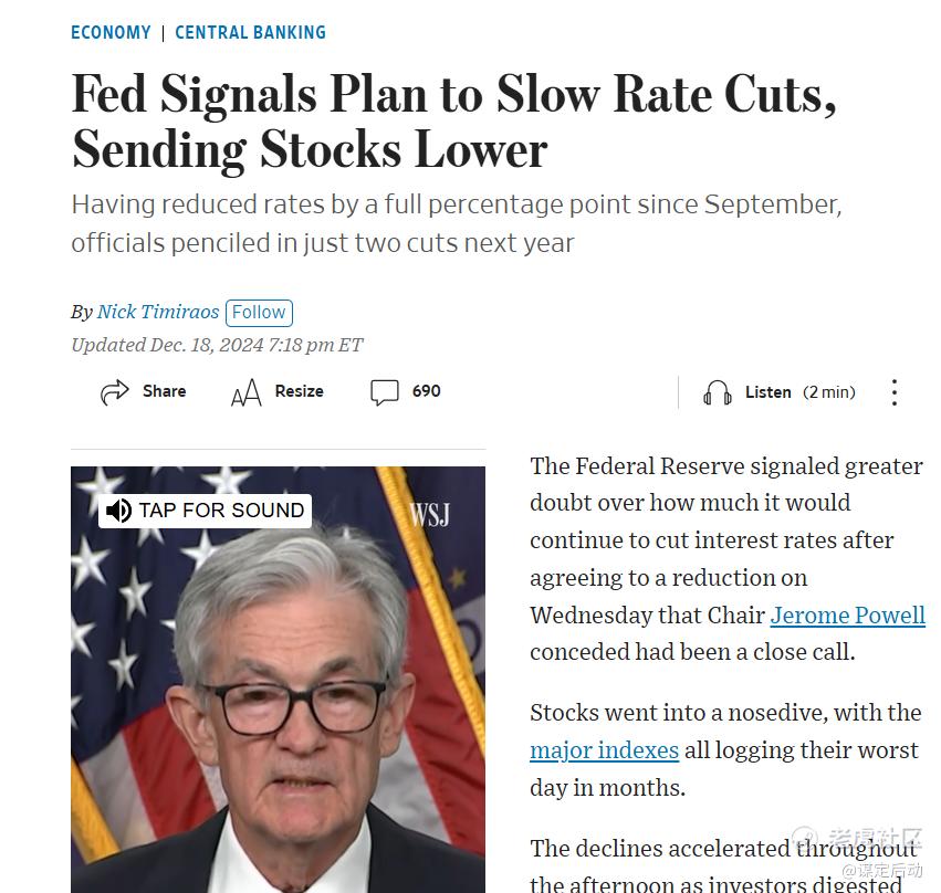 有美联储传声筒之称的《华尔街日报》记者Nick Timiraos于前天在《华尔街日报》发表的文章《Fed Signals Plan to Slow Rate Cuts, Sending Stocks Lower》评论了美联储议息会议后市场的看法:美联储在其最新会议上决定再次降息,将基准联邦基金利率下调至4.25%-4.5%的范围,这是2024年的第三次降息。然而,美联储官员表示,未来可能会放缓降息步伐,甚至减少2025年的降息次数。这一信号导致市场对进一步宽松政策的预期下降,股市因此受挫。