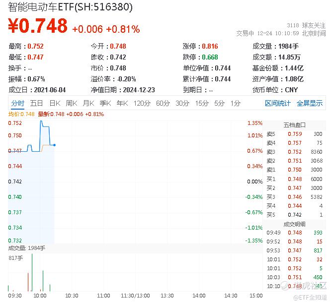 热门ETF方面,较多布局汽车智能化龙头标的的智能电动车ETF(516380)场内价格盘中上探1.35%,现涨0.81%。