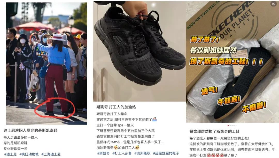 在网上搜索“工鞋+斯凯奇”,你会发现无论是迪士尼的演职人员、澳洲的打工仔,还是国内五星级酒店的餐饮部员工,都把斯凯奇作为了自己的工鞋和通勤鞋,因为穿着它可以走很多路、久站不累,还有透气、不打滑的优势加成。