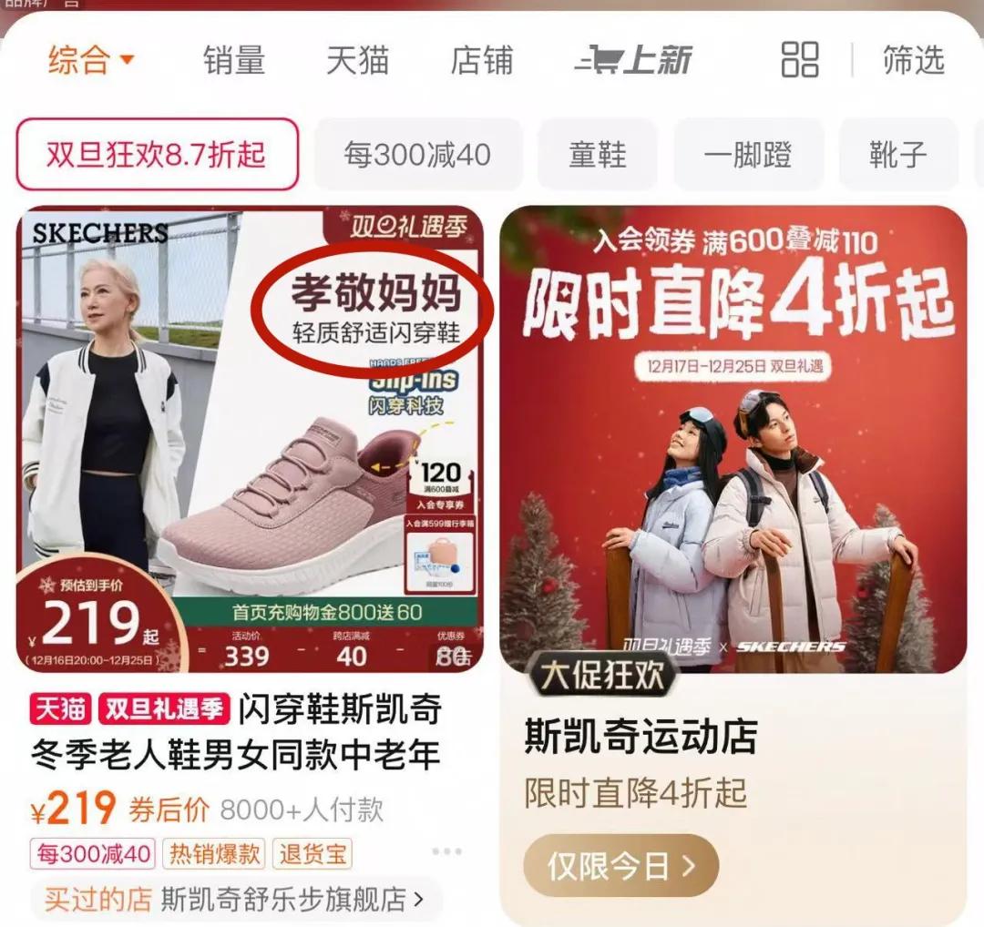它甚至成了“敬老必备”。小红书上有个搜索词条叫“斯凯奇父母鞋推荐”,目前已经有6万+笔记,这是其他运动鞋都不曾有的“荣誉”,原因是斯凯奇很多款鞋都是“一脚蹬”,穿鞋不用弯腰,还能让爱散步的老年人每天走一万多步都不累。有网友会管斯凯奇叫“老爸鞋”“妈妈鞋”,叫到最后,甚至斯凯奇自己在卖鞋的时候都会打上“孝敬妈妈”的标签。