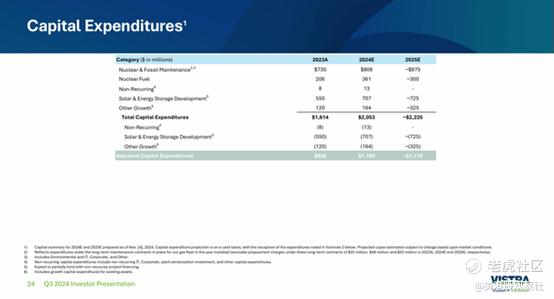 Vistra的资本支出计划令人印象深刻。从实际的2023年水平来看,到2025年,2025年的年度支出计划在核能和化石燃料维护方面增长20%,在核燃料方面增长46%,在太阳能和能源储存开发方面增长32%,以及其他增长项目的支出增长约170%。