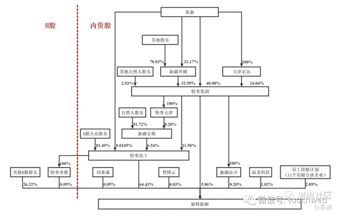 公司实际控制人为自然人张新。张新通过特变集团(特变集团实际控制人为张新)持有5.86%的内资股股份;通过特变电工(特变电工第一大股东为特变集团,实际控制人为张新)持有特变电工 64.43%的内资股股份;通过新疆远卓(新疆远卓系特变集团的全资子公司)持有新特能源0.20%的内资股股份;通过特变香港(特变香港系特变电工的全资子公司)持有新特能源0.09%的H股股份。
