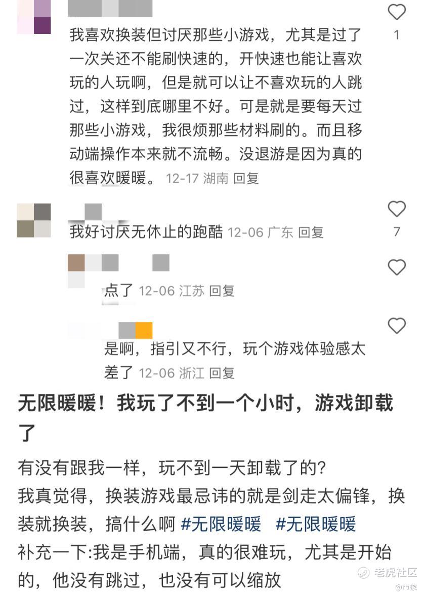 “《暖暖》系列都是换装游戏,我作为一个对换装游戏相对感兴趣的玩家,《无限暖暖》并不能让我很好的感受到换装游戏的乐趣,目前强行把换装玩法跟大世界探索结合起来带给玩家的感受就是效率低。”曼妮作为对换装游戏感兴趣的玩家,表达了自己的不满。
