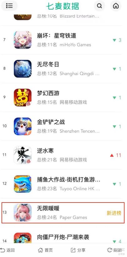 但游戏正式上线后,据七麦数据监测显示,《无限暖暖》在国区App Store游戏畅销榜首日的最高名次仅为第13名。不过从官方信息看,《无限暖暖》全球下载量成功跨越1000万量级。DataEye预估,该游戏上线首周在五个海外市场的双端总收入可达3071.6万元,总流水大致在4200万上下。