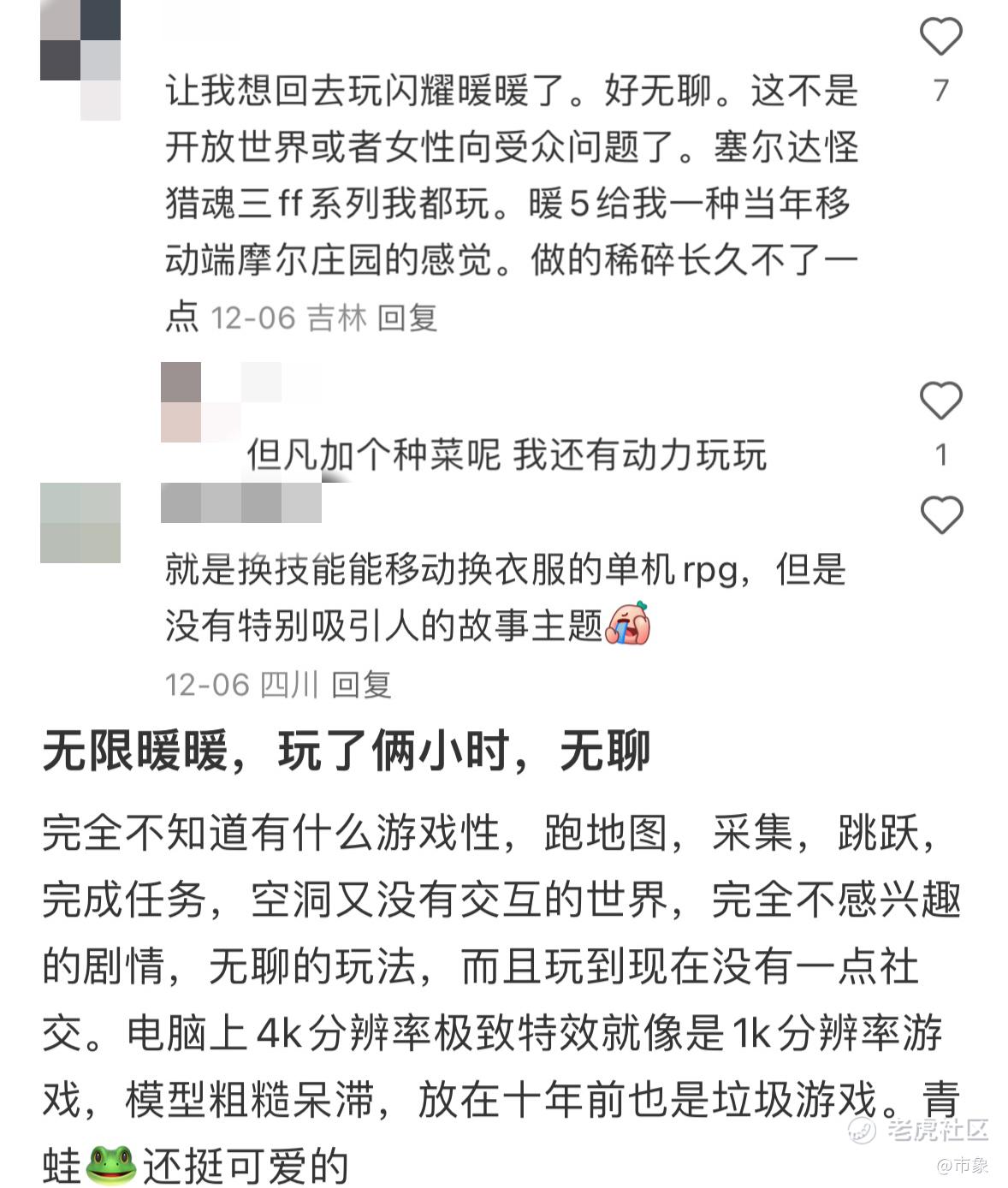 开放世界的玩法吸引了很多非《暖暖》系列粉丝前来尝鲜。其中不乏有被暖暖圈粉,苦肝游戏的玩家,有相当一部分用户反馈:画面确实细腻,服装、场景都是细节,但内核空洞无趣,操作上也相当奇怪。