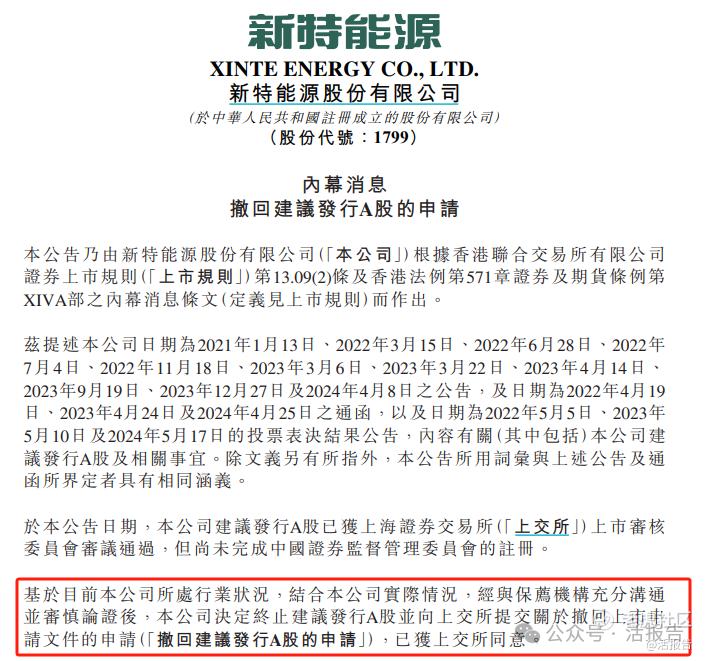 12月24日,高纯多晶硅供应商新特能源(1799.HK)发布公告称,根据公司实际情况、保荐机构充分沟通及审慎论证,公司决定撤回建议发行A股申请。