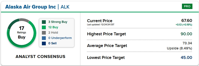 Alaska Airlines(ALK)今年上涨了73%,分析师认为该股有约16%的上涨潜力。Alaska Airlines被摩根士丹利列为明年的最佳航空股,分析师指出,9月Alaska Airlines以19亿美元收购夏威夷航空是其增长的催化剂。