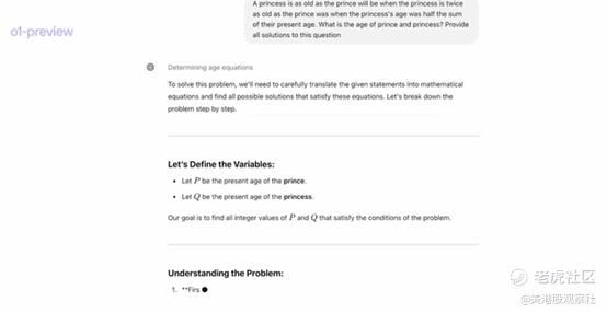 这是一个“o”模型在给出“公主的年龄是...”这个问题的答案之前开始“思考”的例子。如你所见,模型开始分解问题,使其对自身更清晰。