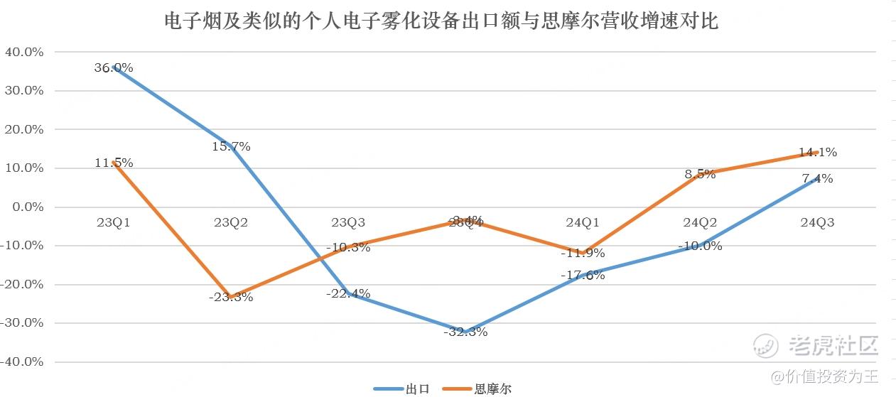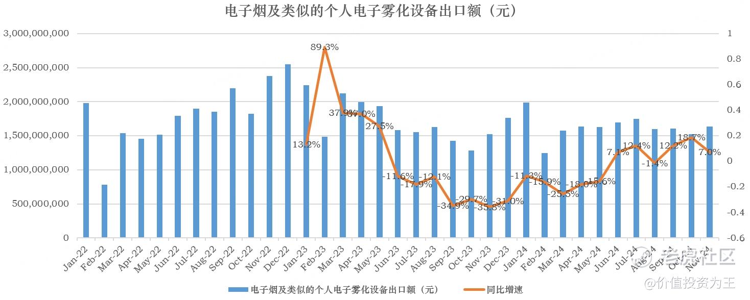 由此来看,思摩尔业绩已经出现拐点,结合中国电子烟及类似的个人电子雾化设备出口额情况来看,今年10-11月,此类产品出口金额达到31.6亿,同比增长12.4%: