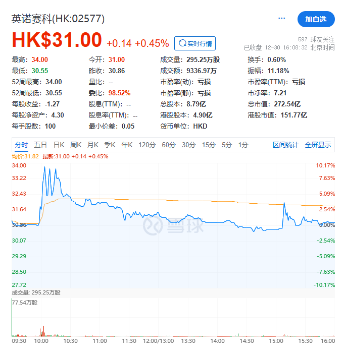 截至首日收市,英诺赛科每股报31.00港元,涨0.45%,总市值约272.54亿港元。