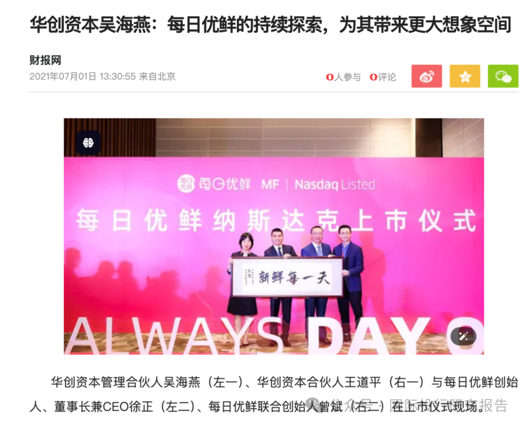 3 、 因为是私募基金,华创资本不会公布全部的业绩的。凌通社印象深刻的是华创资本的投资的每日优鲜,看了一下现在的股价是 0.0001美元,差不多就是清零了。和华创资本一起清零的还有青岛地方政府的 20 亿也已经清零。