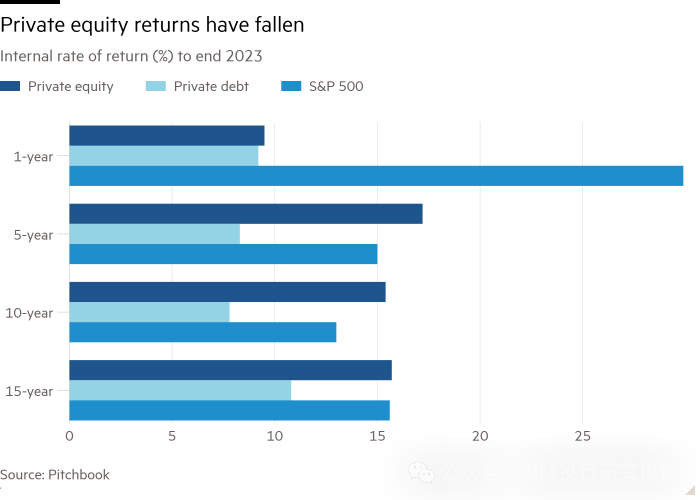 PitchBook 表示,截至 2024 年 3 月的一年中,私募股权的年化内部收益率跌至 10% 以下。这远低于该行业过去设定的 25%,甚至低于股权成本的粗略基准。在同一时期(诚然,这一时期非常惊人),对标准普尔 500 指数的无杠杆投资将获得 30% 的回报。