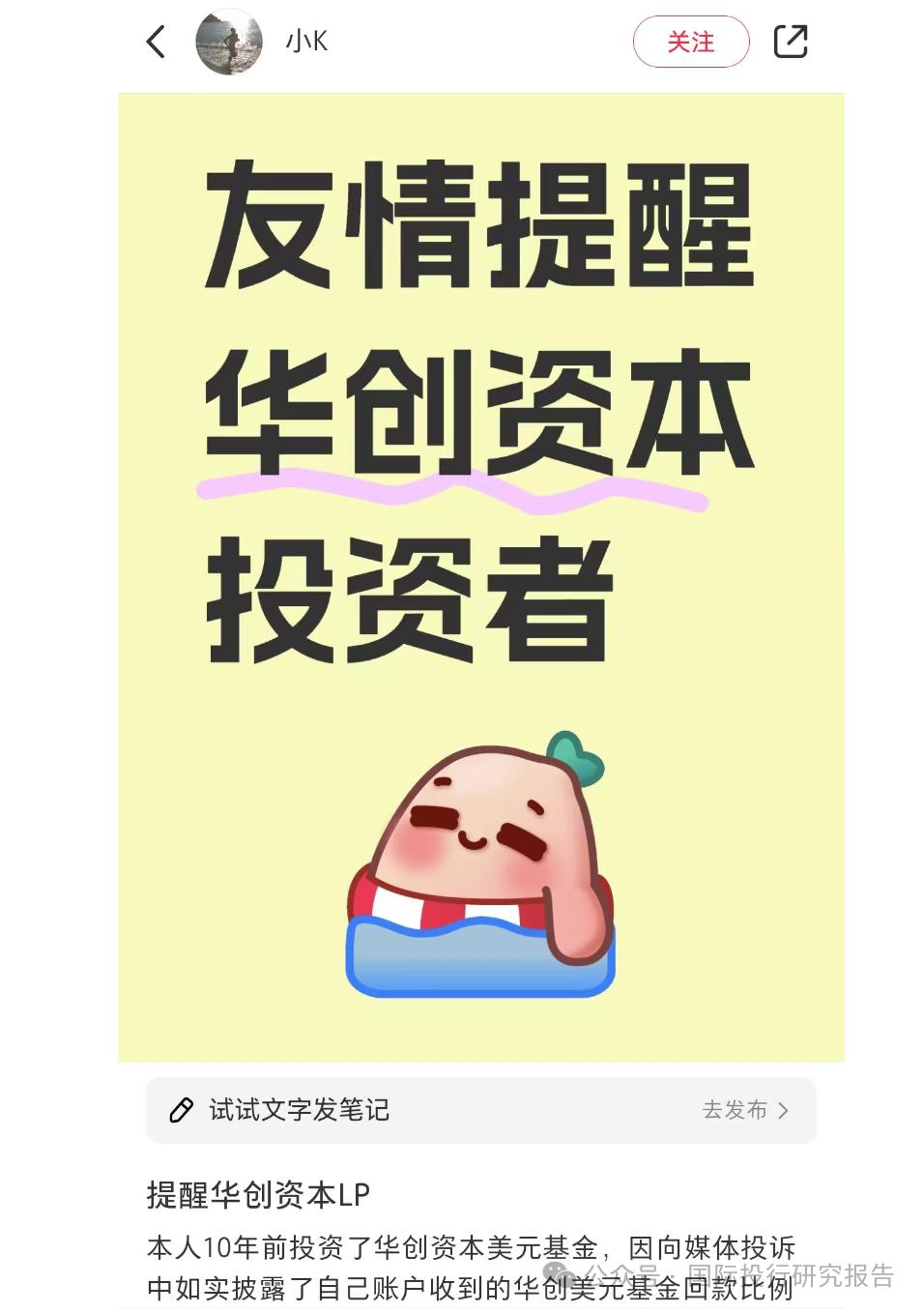 刷到一个好玩的,小 K 10 年前投了华创资本的美元资金,然后一直亏损,小 K 把 DPI(美元基金汇款比例)给媒体投诉,然后华创资本以披露保密信息的理由起诉了 LP 。