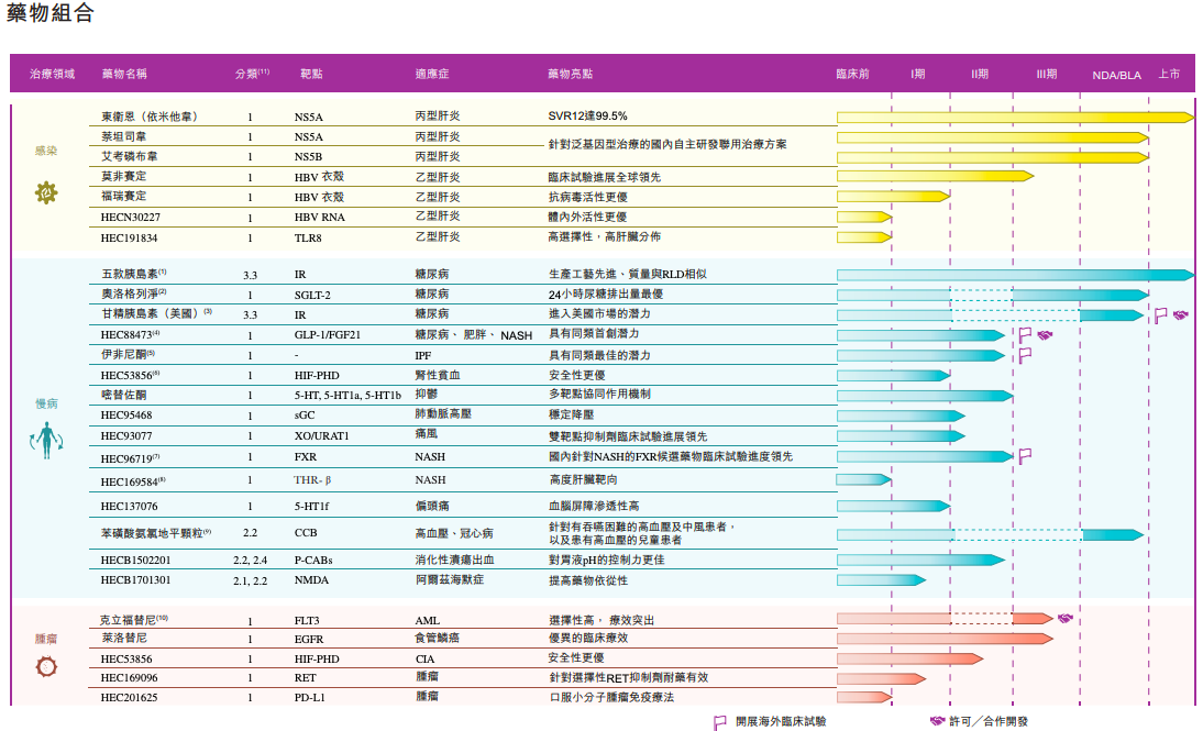 醉心研发兑现在研发管线上,截至2024年6月30日,东阳光药业在感染、慢病、肿瘤领域有超过100款在研药物,包括45款1类在研创新药物,其中3款创新药已处于NMPA中国上市评审中,10款在研创新药处于II期或III期临床试验中。