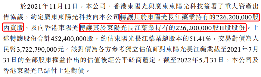 2021年,A股东阳光科技为专注电子新材料、合金材料和化工产品主业发展,剥离了医药制造业务板块,将所持有的东阳光长江药业51.41%的股份出售给了东阳光药业及其控股子公司香港东阳光销售有限公司(简称“香港东阳光”),作价37.23亿元。