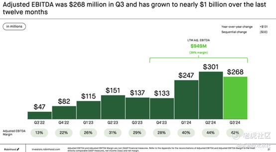 与此同时,Robinhood继续利用其多个收入来源产生健康的盈利能力,第三季度调整后的EBITDA也同比增长一倍多,达到2.68亿美元,占42%的调整后EBITDA利润率(同比增长14个百分点)。