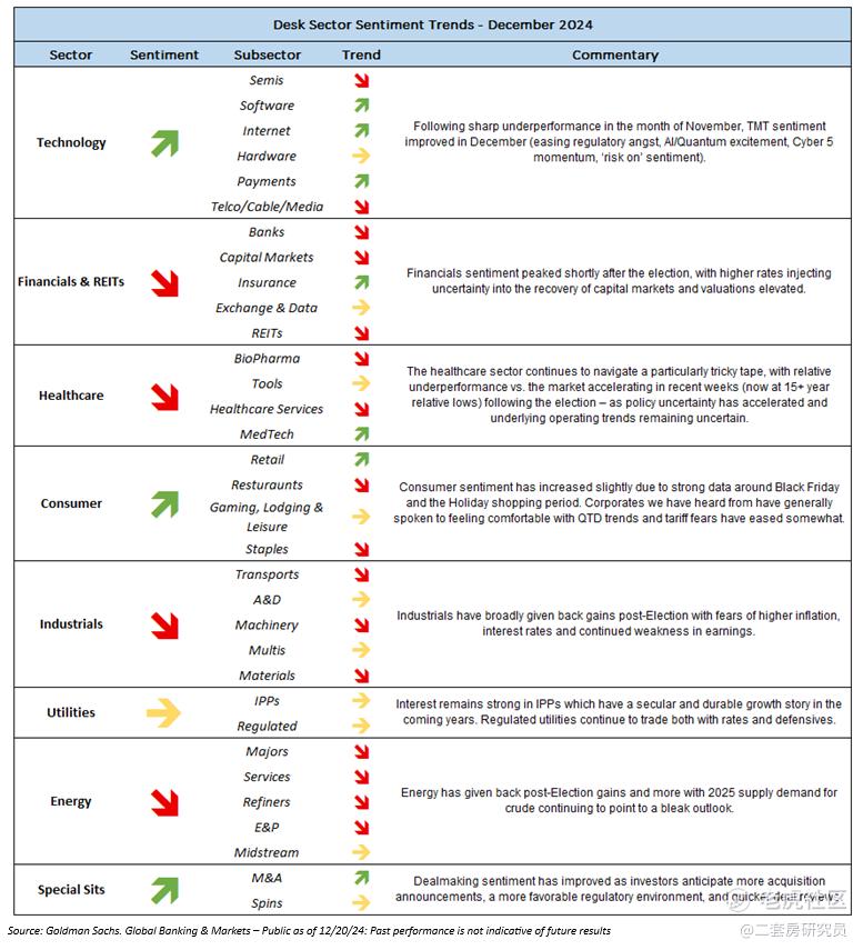 高盛全球银行和市场部门分析了截至12月底投资者对不同行业和子行业的情绪趋势。从大类版块来看,科技(XLK)、消费(XLY)等趋势向上,金融&REITS(XLF & VNQ)、医疗保健(XLV)、工业(XLI)、能源(XLE)向下,公用事业(XLU)持平。