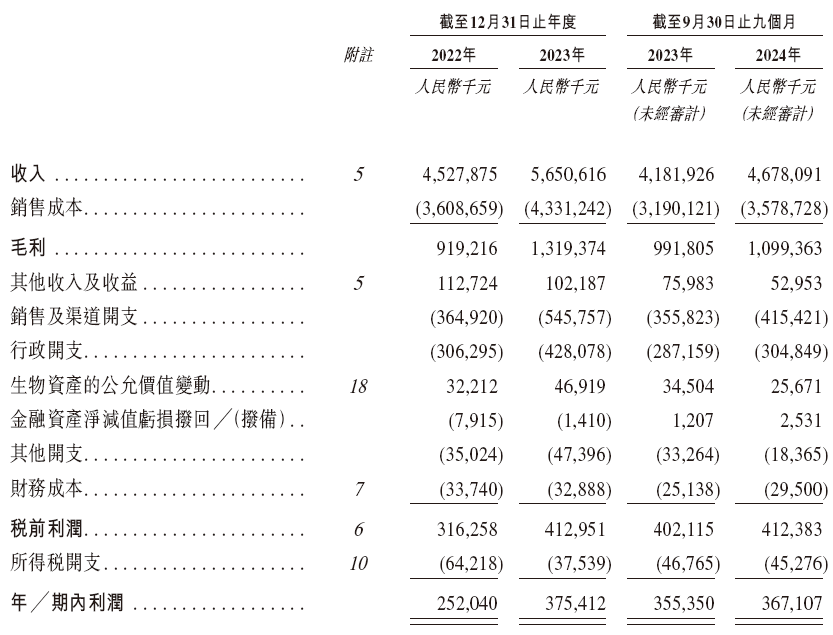 招股书显示,在过去的2022年、2023年和2024年前九个月,老乡鸡的营业收入分别为人民币45.28亿、56.51亿和46.78亿元,相应的净利润分别为人民币2.52亿、3.75亿和3.67亿元。