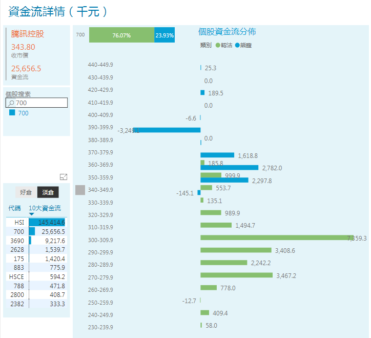 观察个股认股证资金流向,上周五腾讯成升市主力,好仓资金趁机沽货离场,净流出6910万元,而淡仓则净流入2560万元。另外,也观察到资金于周五腾讯大幅上升时,转向部署认沽证,录得约2210万元资金流入,为上周五最多资金流入的个股相关资产。牛熊证方面,也见上周五资金倾向部署熊证,录得约360万元资金流入,而牛证则录得约1190万元资金流出。