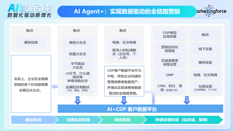 Marketingforce在企业数智化转型领域拥有丰富的探索和实践经验,以AI Agent技术作为核心引擎,打造覆盖全渠道的一站式营销与销售智能工具,助力企业突破“人力限制”与“数据孤岛”困境。