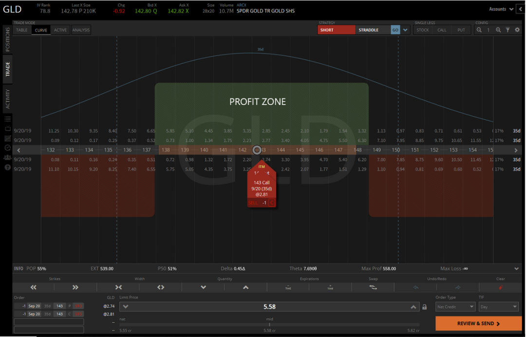 让我们看一个卖空黄金ETF(GLD)波动率的例子。目前在GLD中的IVR是79%,其价格是142.78美元。在9月到期的143行权价上跨设期权可以以$ 5.58的信用额出售,因为您可以以$2.81的价格出售ATM看涨期权,并以$ 2.74的价格出售ATM认沽期权。因此,接下来35天的获利区域介于137.20美元至148.36美元之间,这相当于在没有亏损的情况下,任一方向的涨幅约为+ -4%。如果提早获利,该策略将有80%的成功机会。