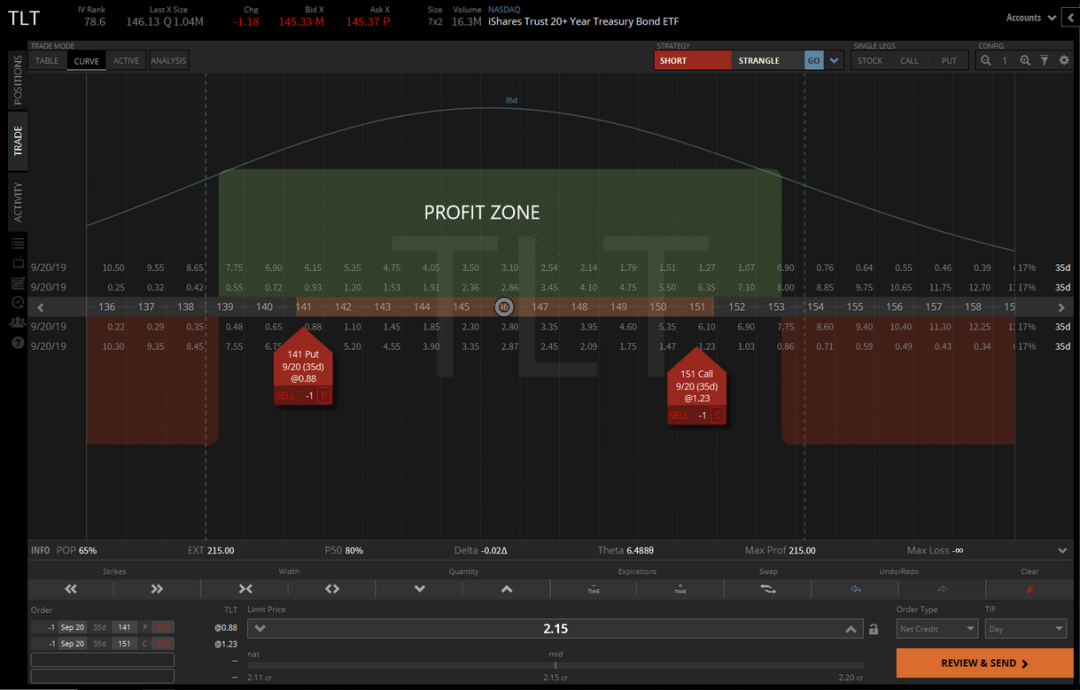 交易者可以在9月到期时卖出141个看跌期权并卖出151个看涨期权,从而在TLT中短暂受压,总期权费为2.15美元。