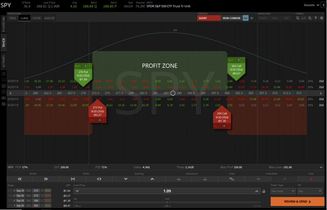 目前,SPY的IVR为36%,价格为288.81美元。交易者可以在9月到期时以$ 1.09的总信用价卖出$ 3的价差,方法是卖出执行价为273的看跌期权和299的看涨期权,同时买入270个看跌期权和302买权。接下来的35天的获利区域为$ 271.91- $ 300.09,这意味着价格可以波动+ 4%或下跌-6%而不会出现交易亏损。如果价格在到期时超出盈亏平衡点,则交易员可以损失的最大值为-$ 1.91。提早获取利润时,该策略就有71%的获利可能性。